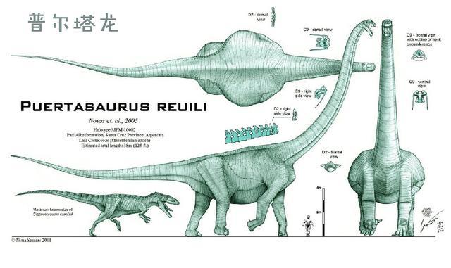另一個有力競爭者是普爾塔龍,它與阿根廷龍一樣,只發(fā)掘出巨大的脊椎骨,估計體長大約在30~40米,體重估計有80~90噸。
