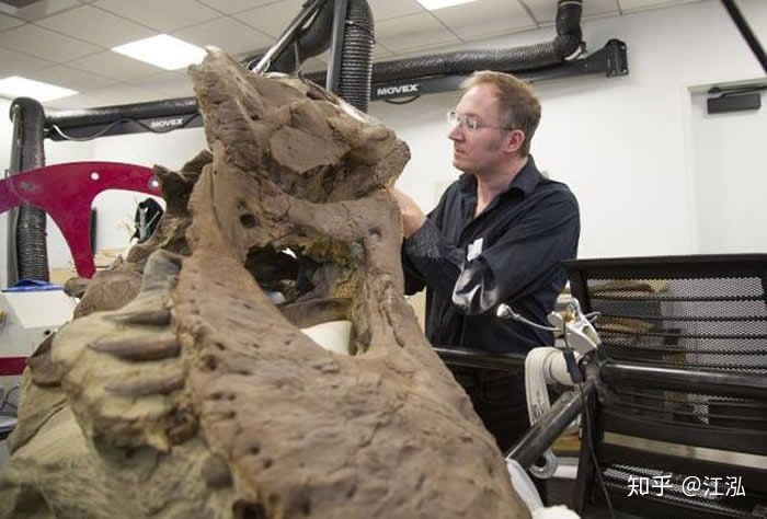 圖注:托馬斯•卡爾正在研究霸王龍的頭骨,圖片來自網(wǎng)絡(luò)