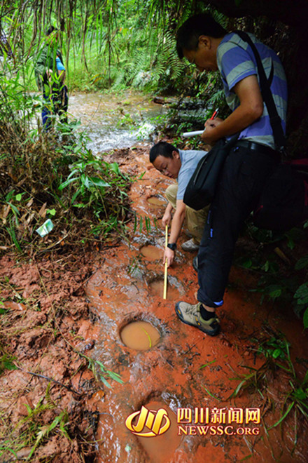 隨后,專家組對大石鄉(xiāng)新陽村桫欏溝恐龍足跡進行考擦,龍井和新陽兩地相距直線距離約1500米。繼上次發(fā)現(xiàn)獸腳類恐龍的巖石上,再次發(fā)現(xiàn)蜥腳類恐龍?!斑@里保存著極好的獸腳類恐龍行跡?!鲍F腳類恐龍是一種兇猛的肉食性恐龍,是當(dāng)?shù)匕l(fā)現(xiàn)的蜥腳類足跡和鳥腳類足跡的造跡者的天敵。從足跡可推斷獸腳類恐龍長約4-6米。生活年代在白堊紀時期,距今約一億年。