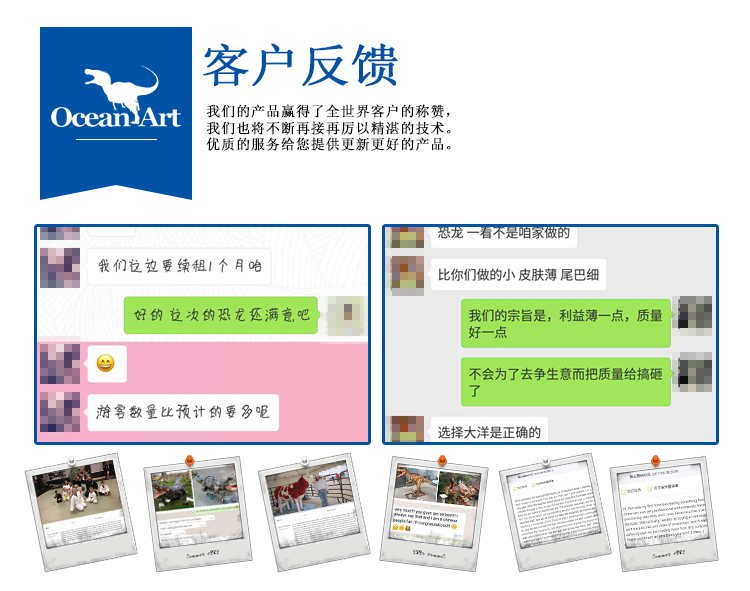 備注:我們注重展覽和產(chǎn)品本身的文化底蘊(yùn)及科技含量,并且關(guān)注產(chǎn)品與觀眾的互動(dòng)性、娛樂性和參與性,因此,我們先后推出了騎乘恐龍、打斗恐龍組、生蛋龍、蓋章恐龍、恐龍衣服等一系列,科技含量高,故事情節(jié)豐富,娛樂參與性極強(qiáng)的產(chǎn)品,深受廣大消費(fèi)者的青睞。除了產(chǎn)品的研發(fā)與制造,公司的營銷核心是一套成熟的、創(chuàng)新性的展覽理念,并在海內(nèi)外都取得了廣泛的成功!