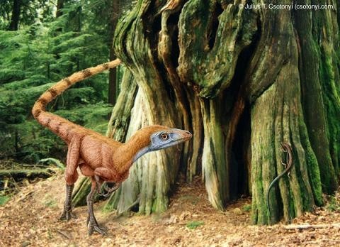 這只世界上所發(fā)現(xiàn)的第一只長(zhǎng)有絨狀細(xì)毛的恐龍,被命名為原始中華龍鳥(niǎo),是一種介于恐龍與鳥(niǎo)類之間的過(guò)渡型生物,可能代表了鳥(niǎo)類起源和演化的祖先類型。它擁有一個(gè)大頭顱,樣子與雞相近,前肢短小,后肢長(zhǎng)而粗壯;嘴里的銳利牙齒,說(shuō)明它是一只活躍的掠食者。除了長(zhǎng)毛以外,它那條由多達(dá)58節(jié)尾椎骨所組成的特長(zhǎng)尾巴,也是一個(gè)重要的特征。它生活在中國(guó)的白堊紀(jì)早期,以蜥蜴為生。