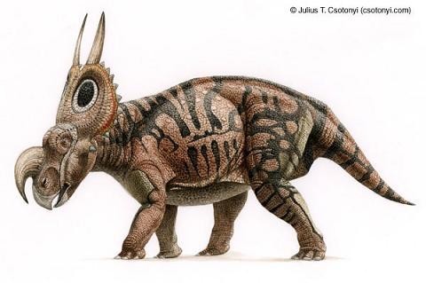 野牛龍生活在白堊紀(jì)晚期,大約6 米長(zhǎng)、1米高,頭部有三只大角,脖子上有一個(gè)大頸盾,邊緣有齒狀骨質(zhì)突起。它是由山普森(Sampson)在1994年發(fā)現(xiàn)的三個(gè)頭骨化石命名的。像其它角龍一樣,它在獸群中穿行,有牙齒,能咀嚼最硬的植物。